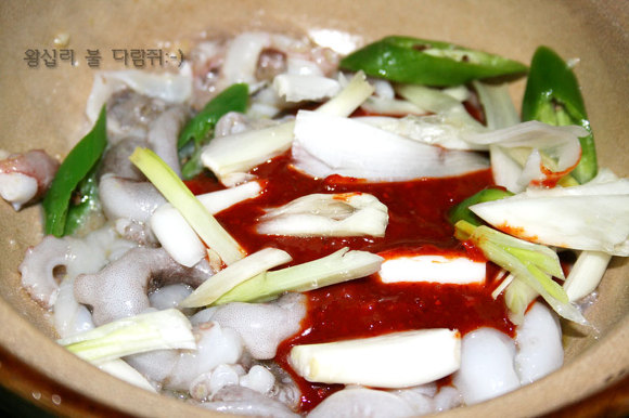 재료: 오징어, 떡, 당면, 고구마, 마늘, 파, 양파, 고추(청양고추 사용),