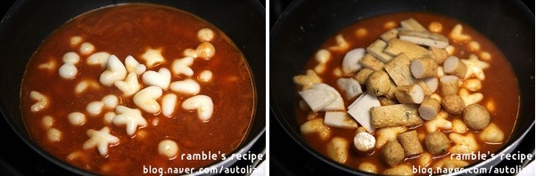 떡볶이 국물이 끓기 시작하면 떡볶이떡과 어묵을 넣어주세요.