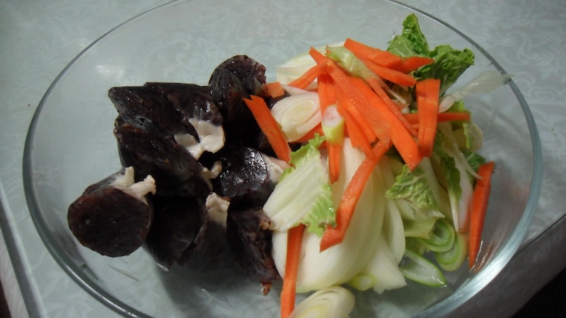㉠ 순대는 찜통에 쪄서 먹기 좋은 크기로 썬다. ㉡ 각종 채소도 먹기 좋은 크기로 썰어 준비한다.